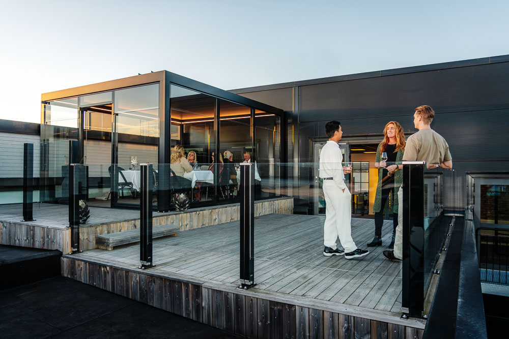 Glass balustrades with free glass edges and wind protection that can easily be raised and lowered