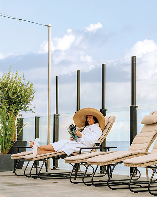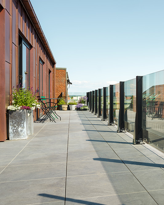 Stylish glass balustrades in standard height that frame the outdoor environment